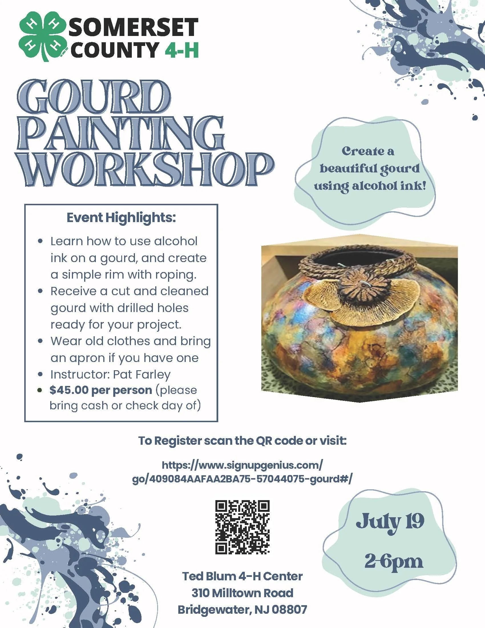 Create a beautiful gourd using alcohol ink! Learn how to use alcohol ink on a gourd and create a simple rim with roping, guided by instructor Pat Farley. Receive a cut and cleaned gourd with drilled holes ready for your project. Wear old clothes and bring an apron if you have one. Open to teens and adults ages 15 and up.