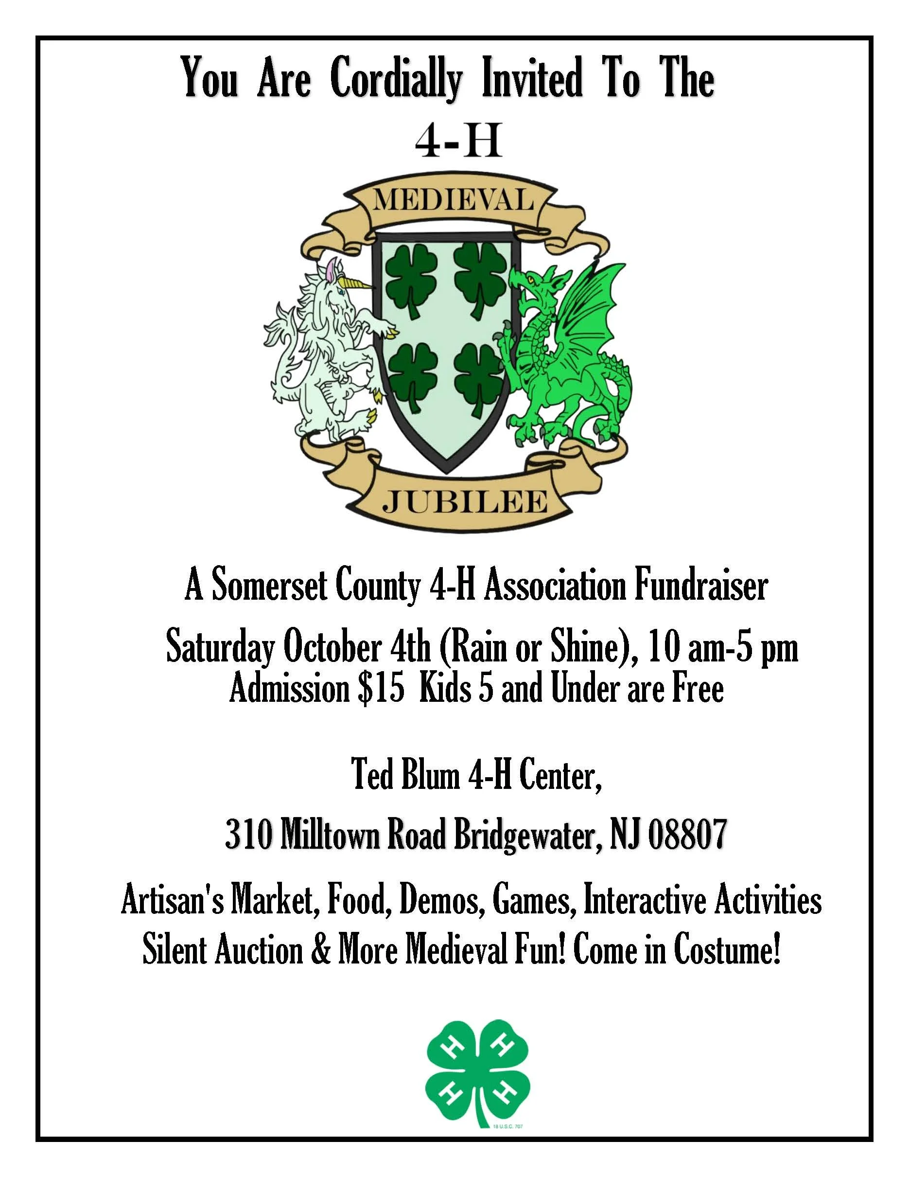 A land of merriment awaits, at the 4-H Medieval Jubilee! Step back through time with a day full of adventures inspired by medieval Europe, with workshops, entertainment and a bustling artisan marketplace. Tickets are 15 dollars, rain or shine. Children 5 years old & under get in for FREE!