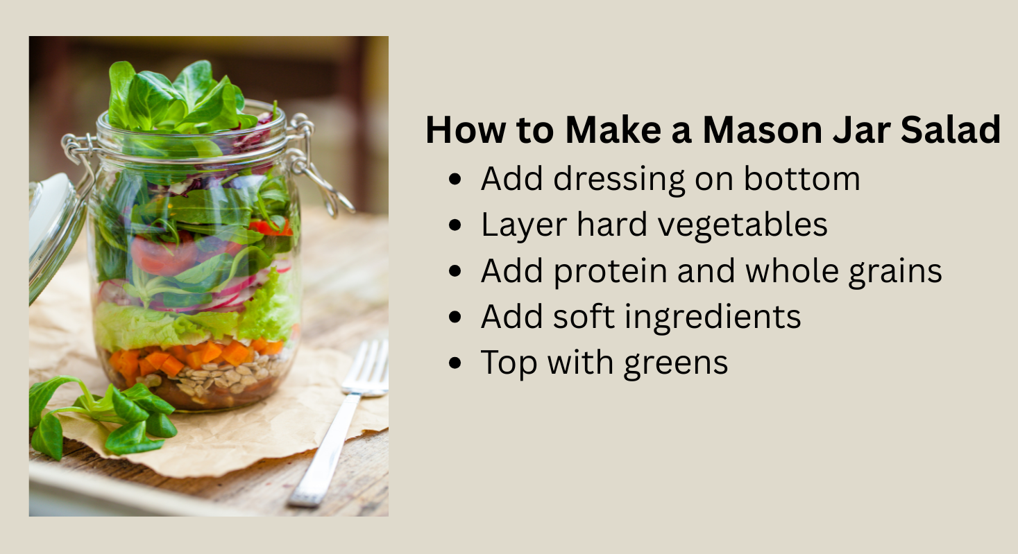 Mason jar salads are another simple way to enjoy a balanced lunch that can be made the night or days before.